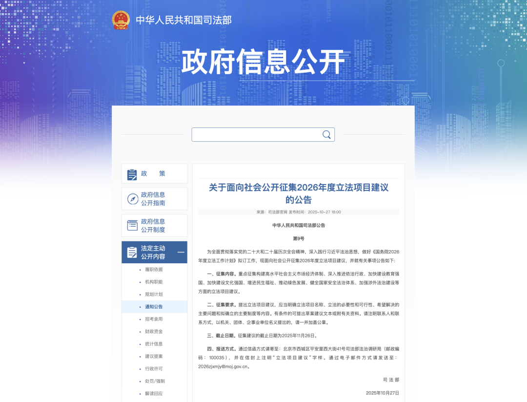 10月27日,司法部正式启动《2026年度立法项目建议征集》,征集期截至2025年11月26日。